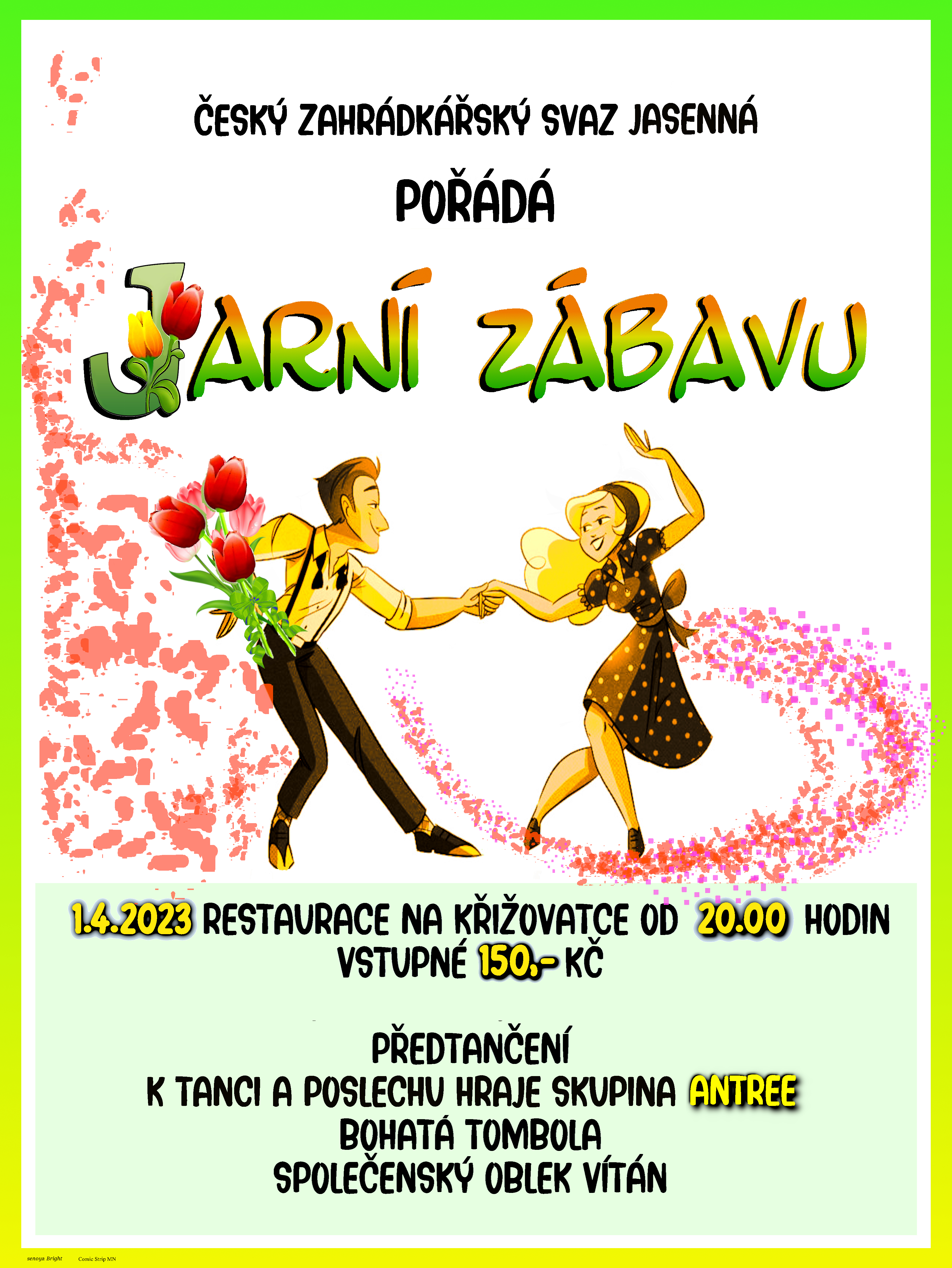 Český zahrádkářský svaz v Jasenné pořádá jarní zábavu v sobotu 1. 4. 2023 od 20 hodin v sále Restaurace Na Křižovatce. K tanci a poslechu hraje skupina Antree. Připravena je bohatá tombola a předtančení.