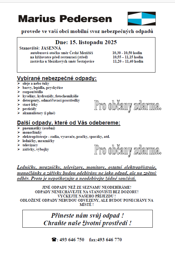 V sobotu 15. listopadu 2025 proběhne mobilní svoz nebezpečných odpadů. Sběrna bude přistavena na autobusové otočce směr České Meziříčí od 10,30 do 10,50 hodin, před Restaurací Na Křižovatce od 10,55 do 11,15 hodin a na zastávce u Slezákových směr Šestajovice od 11,20 do 11,40 hodin. Každý musí sám svůj odpad odevzdat přímo obsluze sběrny.